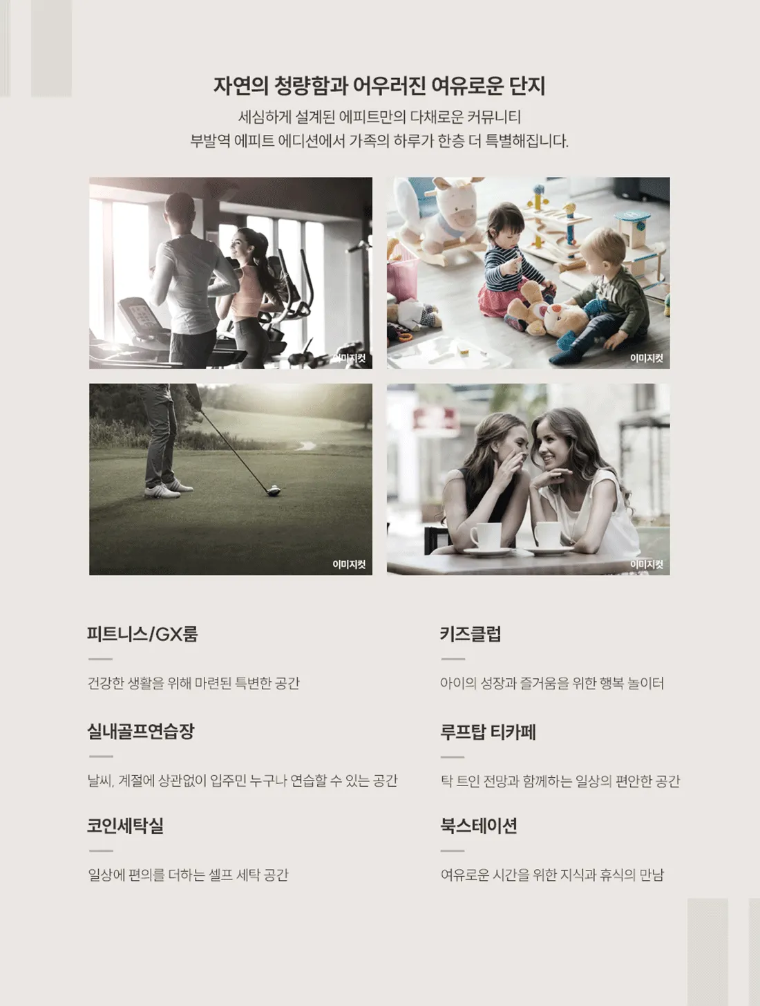 공원형 단지구성과 혁신 평면으로이천의 자부심이 올라갑니다 COMMUNITY일상에 활력과 여유로움을 더하는 에피트만의 특화 커뮤니티로 더 특별한 라이프가 펼쳐집니다 이천 부발역 에피트 에디션 계약금 1,000만원 중도금 입주시까지 무이자모델하우스 방문은 사전예약후 방문해 주세요 010-2898-6960 방문 예약